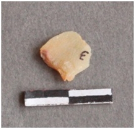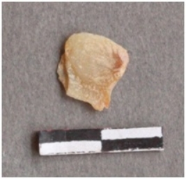 | Description / विवरण | Chalcedony translucent flake with retouched bulb of percussion on one side, a thin fragment of cortex seen. |