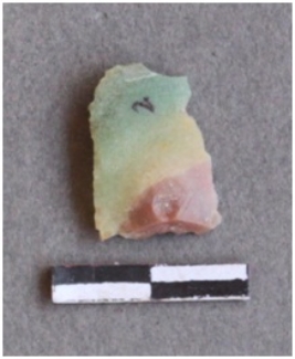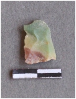 | Description / विवरण | Banded chert flake with a bulb of percussion eraillure flakes seen on the bulb of percussion, brown and light green bands. |