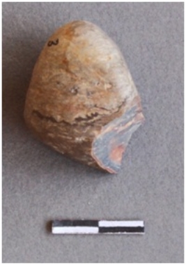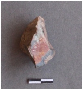 | Description / विवरण | Banded chert stone waste fragments have been removed for manufacturing purpose, cortex on one full side. |