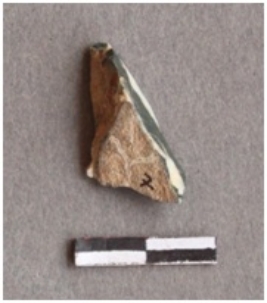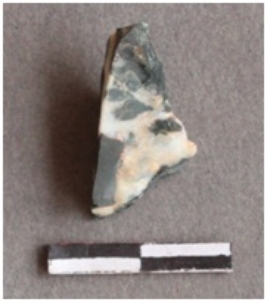 | Description / विवरण | Banded jasper stone fragment with patinated cortex on one side dark seen with white bands. |