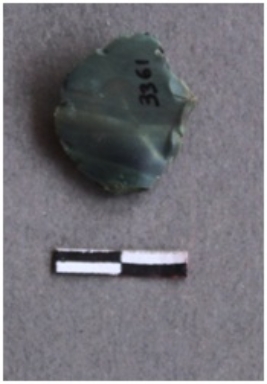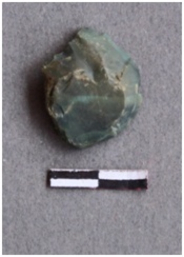 | Description / विवरण | This chert in dark grey and light blue bands. There is a bulb of percussion on one side, with a striking platform. |