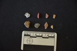 | Description / विवरण | 9 Flakes by product of tool manufacturing have flake scars and ridges on surface-3 of them have striking platform and bulb on ventral side. |