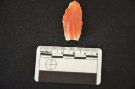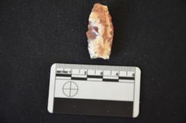 | Description / विवरण | A carnelian core with platform and five blade scars and cortex on one surface. |