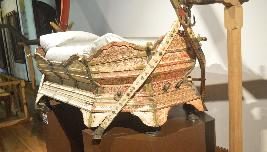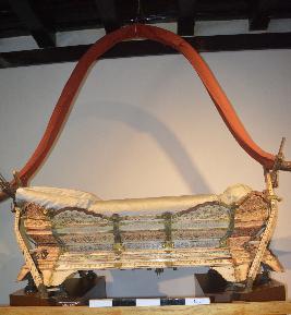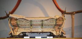| Description / विवरण | A palanquin made of wood, fitted with thin ivory planks on the base and painted showing some flower designs and birds like Peacock, Parrot, Mythological animals like Vyali etc. The palanquin is supported by one bended iron rod (Arch shaped). The rod is covered with cane work. The front side of the rod is fitted with a gold plated brass flat head. Silver laced silk cloth, partly damaged, is used as the canopy cover. Six silk velvet cushions with laced top adorn the seat (two circular, two cylindrical, one square and one mattress). The seat of the palanquin is woven with cotton tape. Also many laced hangings decorate the canopy and the handle. Two laced silk cloth, highly artistic, cover the front and rear side of the palanquin. Two pinnacles made of gold plated brass adorn the front and rear side of the canopy. The palanquin is seated on eight circular brass bases. |