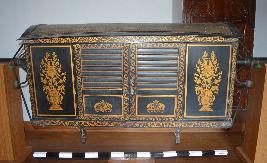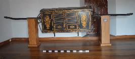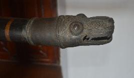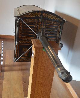 | Condition Description / स्थिति का विवरण | The wooden handle on the right side has a crack. Accumulation of dirt is noticed on the cane seating, silk cloths inside are faded and deteriorated. Silk cloth holders are torn in some parts, the cloth overhead lost its hold from nails and partially hanging. Green corrosion are noticed on the decorated washer and handle. |