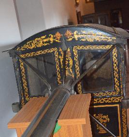 | Description / विवरण | Wooden doli having a cane seat with four sliding doors flanked with paintings of flower vase design. The wooden handle is having silver crocodile heads. The four corners are having brass lamp stands. |