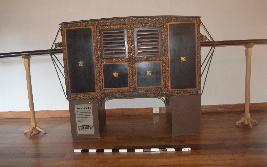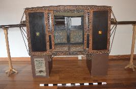 | Condition Description / स्थिति का विवरण | Some leaves of the shutter windows are lost. Accumulation of dirt is noticed on the cane seating, silk cloths of holders inside are faded and deteriorated and the stuffed cotton are come out at some areas. Insect activity is suspected. The metal parts and decorative vyali heads are having signs of corrosion. |