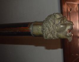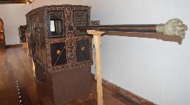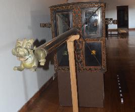 | Description / विवरण | The doli made of wooden with cane seat having four sliding doors. The doors are flanked without much paintings. The handle is having inferior quality silver galloping vyalis head on one side and inferior quality silver lion head on the other side. Four sides of the palanquin are having brass lamp stands. The front side is covered with glass windows. |
