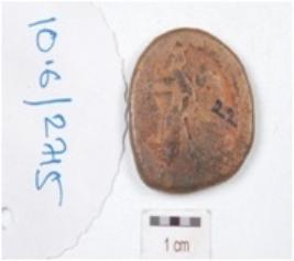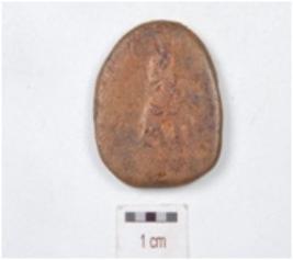 | Description / विवरण | A copper coin, round in shape, image of standing diety with left hand on akimbo and right hand is raised depicted on obverse side and diety riding elephant depicted on reverse side, chemically treated and preserved made by cast technique. |