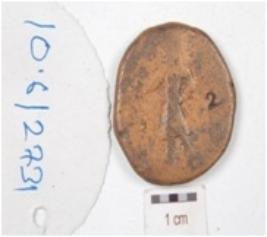 | Description / विवरण | A copper coin, round in shape, image of standing diety with left hand on akimbo depicted on obverse side and standing diety with left hand raised depicted on reverse side, made by cast technique chemically treated and preserved. |