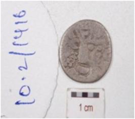 | Description / विवरण | A silver coin, round in shape, having tree motif on one side surface another side surface is not clear and tarnished surface. |