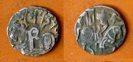 | Description / विवरण | Descrpn./Obv Recumbent bull facing left, wearing jhula (saddle cloth), with trisula (trident) symbol on rump. Above, legend in Sarada script Sri Samantadeva . Descrpn./Rev Rider with lance on caparisoned horse facing right. On left, Sarada letter bhi and on right, Sarada letter ta |