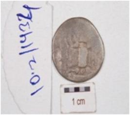 | Description / विवरण | A silver coin, round in shape, having tree motif on one side surface, another side surface is having unidentified motif tarnished surface. |