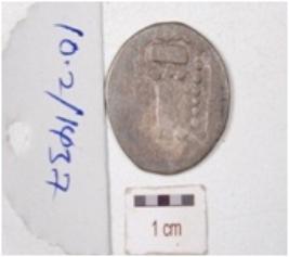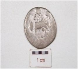 | Description / विवरण | A silver coin, round in shape, having tree motif on one side surface, another side surface having unidentified. |