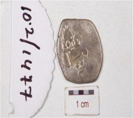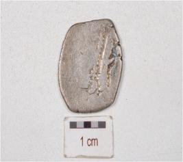 | Description / विवरण | A die struck silver coin, roughly rectangular in shaped, unreadable motif on both the sides and eroded surface. |