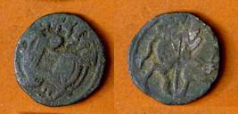| Description / विवरण | Descrpn./Obv Recumbent bull facing left, wearing jhula (saddle cloth), with trisula (trident) symbol on rump. Above, legend in Sarada script Sri Samantadeva . Descrpn./Rev Rider with lance on caparisoned horse facing right. On left, Sarada letter bhi and on right, Sarada letter ta |