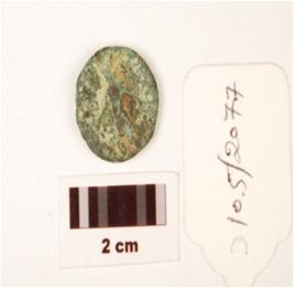| Description / विवरण | A small thin copper coin, round in shape, round edges, picture of human figure is dipicting on obverse and reverse sides, but worn out, corroded, formation of patina is visible on surface. |