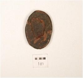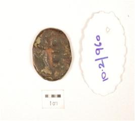 | Description / विवरण | A coin made on copper with smooth surface with obverse side human figure sitting on a elephant and reverse side partly chipped off on surface, circular in shaped. |