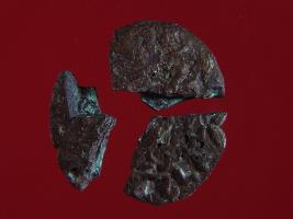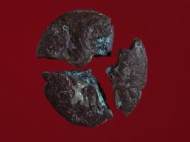 | Description / विवरण | Stratum Layer 11 Coin made of copper alloy. Broken into three pieces and hard patina with dust is deposited on it. It was used for trade purposes in earliar times. Surface is smooth and appearance is of dark brown colour. |