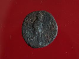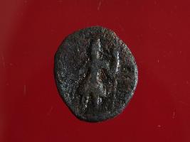 | Description / विवरण | This is copper coin. Shape is circular and surface is smooth. It is treated coin. The depression depict on obverse side is Kartikaya god, holding a spear in one hand and other hand is placed on waist. On reverse side depicts Shasti deity. Appearance is copper brown. |