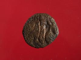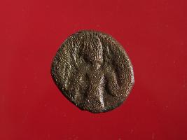 | Description / विवरण | This is copper coin. Shape is circular and surface is smooth. It is treated coin. The depression depict on obverse side is God Shiva seating on bull and there is beaded designed around it. Reverse side depicts a standing human figurine of vasudeva. Appearance is copper brown. |