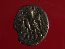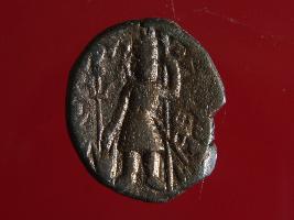 | Description / विवरण | This is a copper coin. Shape is almost circular. Surface is smooth and shine. The depression on the overse side depicts shiva holding a trident in his left hand and another trident is shown near the right hand the vahana below depict bull and reverse side shiva seated on the bull. It is treated coin. Appearance is copper brown. |