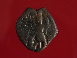 | Description / विवरण | This is a copper coin. Shape is almost circular. Surface is smooth and shine. The depression on the overse side depicts shiva holding a trident in his left hand and another trident is shown near the right hand the vahana below depict bull and reverse side images not clear. It is treated coin. Appearance is copper brown. |