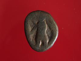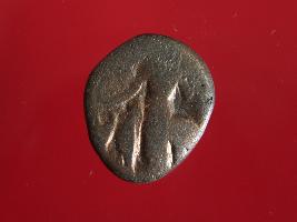 | Description / विवरण | This is a copper coin. Shape is almost circular. Surface is smooth and shiny. The depression on the ovberse side depicts standing human figurine of vasudeva and reverse side is shiva seated on bull. Appearance is copper brown. It is a treated coin. |