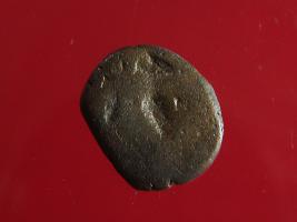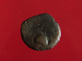 | Description / विवरण | This is a copper coin. Shape is almost circular. Surface is smooth and shiny. The depression on obverse side depicts standing human figurine of vasudeva and reverse side depicts seated human figurine. It is treated coin. Appearance is copper brown. |