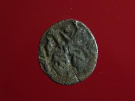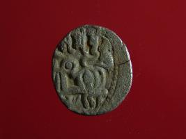| Description / विवरण | This is a copper coin. Shape is almost circular. Surface is smooth. It is a silver coating coin. The depression on obverse side depicts a man sitting on a horse and holding a spear in his right hand and reverse side a bull in a sitting position and some inscriptions written above. Appearance is metallic bronze. |