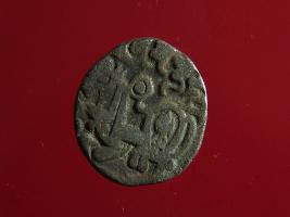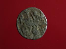 | Description / विवरण | This is a copper coin. Shape is almost circular. Surface is smooth. It is a silver coating coin. The depression on obverse side depicts a man sitting on a horse and holding a spear in his right hand and reverse side a bull in a sitting position and some inscriptions written above. Appearance is metallic bronze. |