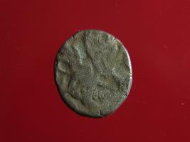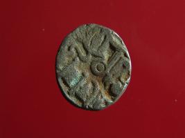 | Description / विवरण | This is a copper coin. Shape is almost circular. Surface is smooth. It is a silver coating coin. The depression on obverse side depicts a man sitting on a horse and holding a spear in his right hand and reverse side a bull in a sitting position and some inscriptions written above. Appearance is metallic bronze. |