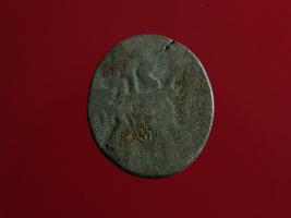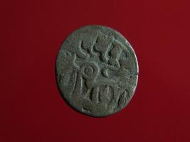 | Description / विवरण | This is a copper coin. Shape is almost circular. Surface is smooth. It is a silver coating coin. The depression on obverse side depicts a man sitting on a horse and holding a spear in his right hand and reverse side a bull in a sitting position and some inscriptions written above. Appearance is metallic bronze. |
