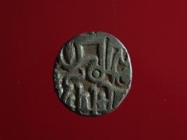 | Description / विवरण | This is a copper coin. Shape is almost circular. Surface is smooth. It is a silver coating coin. The depression on obverse side depicts a man sitting on a horse and holding a spear in his right hand and reverse side a bull in a sitting position and some inscriptions written above. Appearance is metallic bronze. |