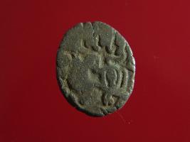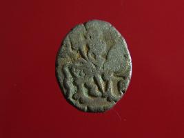| Description / विवरण | This is a copper coin. Shape is almost circular. Surface is smooth. It is a silver coating coin. The depression on obverse side depicts a man sitting on a horse and holding a spear in his right hand and reverse side a bull in a sitting position and some inscriptions written above. Appearance is metallic bronze. |