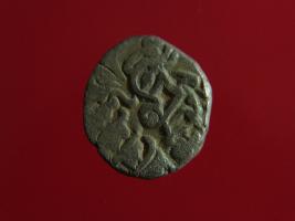 | Description / विवरण | This is a copper coin. Shape is almost circular. Surface is smooth. It is a silver coating coin. The depression on obverse side depicts a man sitting on a horse and holding a spear in his right hand and reverse side a bull in a sitting position and some inscriptions written above. Appearance is metallic bronze. |