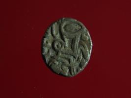 | Description / विवरण | This is a copper coin. Shape is almost circular. Surface is smooth. It is a silver coating coin. The depression on obverse side depicts a man sitting on a horse and holding a spear in his right hand and reverse side a bull in a sitting position and some inscriptions written above. Appearance is metallic bronze. |