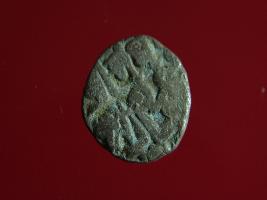 | Description / विवरण | This is a copper coin. Shape is almost circular. Surface is smooth. It is a silver coating coin. The depression on obverse side depicts a man sitting on a horse and holding a spear in his right hand and reverse side a bull in a sitting position and some inscriptions written above. Appearance is metallic bronze. |