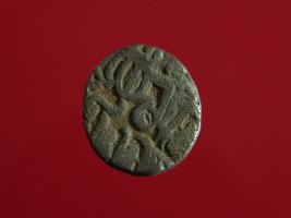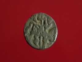 | Description / विवरण | This is a copper coin. Shape is almost circular. Surface is smooth. It is a silver coating coin. The depression on obverse side depicts a man sitting on a horse and holding a spear in his right hand and reverse side a bull in a sitting position and some inscriptions written above. Appearance is metallic bronze. |