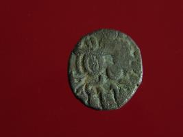 | Description / विवरण | This is a copper coin. Shape is almost circular. Surface is smooth. It is a silver coating coin. The depression on obverse side depicts a man sitting on a horse and holding a spear in his right hand and reverse side a bull in a sitting position and some inscriptions written above. Appearance is metallic bronze. |