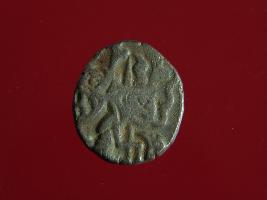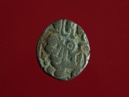 | Description / विवरण | This is a copper coin. Shape is almost circular. Surface is smooth. It is a silver coating coin. The depression on obverse side depicts a man sitting on a horse and holding a spear in his right hand and reverse side a bull in a sitting position and some inscriptions written above. Appearance is metallic bronze. |