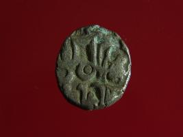 | Description / विवरण | This is a copper coin. Shape is almost circular. Surface is smooth. It is a silver coating coin. The depression on obverse side depicts a man sitting on a horse and holding a spear in his right hand and reverse side a bull in a sitting position and some inscriptions written above. Appearance is metallic bronze. |