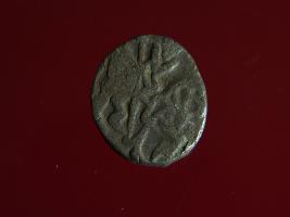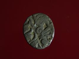 | Description / विवरण | This is a copper coin. Shape is almost circular. Surface is smooth. It is a silver coating coin. The depression on obverse side depicts a man sitting on a horse and holding a spear in his right hand and reverse side a bull in a sitting position and some inscriptions written above. Appearance is metallic bronze. |