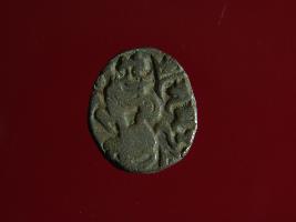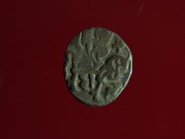 | Description / विवरण | This is a copper coin. Shape is almost circular. Surface is smooth. It is a silver coating coin. The depression on obverse side depicts a man sitting on a horse and holding a spear in his right hand and reverse side a bull in a sitting position and some inscriptions written above. Appearance is metallic bronze. |