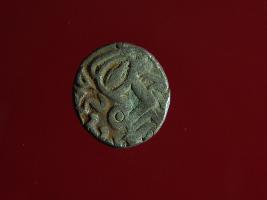 | Description / विवरण | This is a copper coin. Shape is almost circular. Surface is smooth. It is a silver coating coin. The depression on obverse side depicts a man sitting on a horse and holding a spear in his right hand and reverse side a bull in a sitting position and some inscriptions written above. Appearance is metallic bronze. |