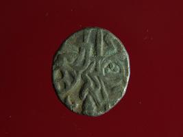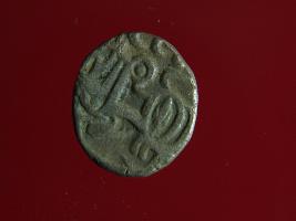 | Description / विवरण | This is a copper coin. Shape is almost circular. Surface is smooth. It is a silver coating coin. The depression on obverse side depicts a man sitting on a horse and holding a spear in his right hand and reverse side a bull in a sitting position and some inscriptions written above. Appearance is metallic bronze. |