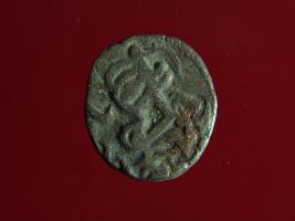 | Description / विवरण | This is a copper coin. Shape is almost circular. Surface is smooth. It is a silver coating coin. The depression on obverse side depicts a man sitting on a horse and holding a spear in his right hand and reverse side a bull in a sitting position and some inscriptions written above. Appearance is metallic bronze. |