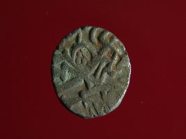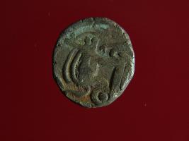 | Description / विवरण | This is a copper coin. Shape is almost circular. Surface is smooth. It is a silver coating coin. The depression on obverse side depicts a man sitting on a horse and holding a spear in his right hand and reverse side a bull in a sitting position and some inscriptions written above. Appearance is metallic bronze. |