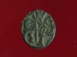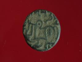 | Description / विवरण | This is a copper coin. Shape is almost circular. Surface is smooth. The depression on obverse side depicts a deity sitting on a horse and holding a trident in his right hand. On reverse side a bull in a sitting position. Appearance is metallic bronze. Hard patina deposited on it. |