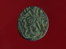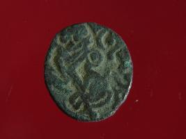 | Description / विवरण | This is a copper coin with coating of silver on it. The depression on obverse side depicts a deity sitting on a horse and holding a spear in his right hand. On reverse side a bull in a sitting position and some inscriptions are written above. Shape is almost circular. Surface is smooth. Appearance is metallic bronze. |